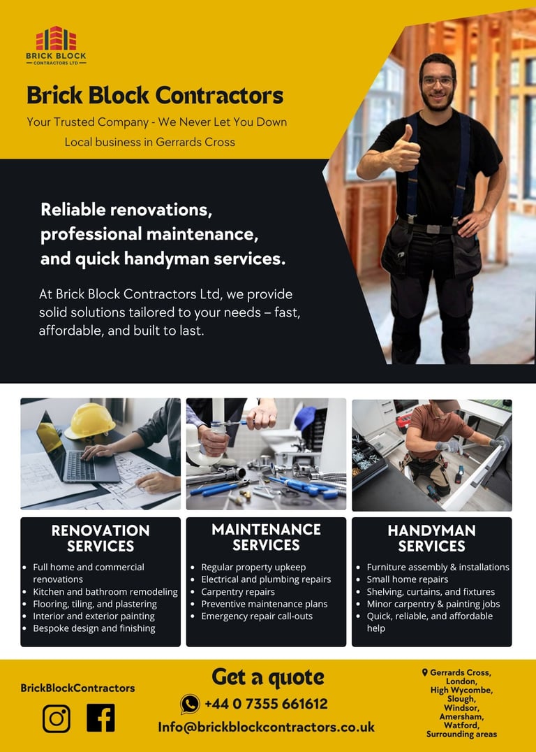 Brick Block Contractors is a trusted local company in Gerrards Cross, specialising in high-quality property refurbishments and repair services. We combine skilled craftsmanship, attention to detail and a professional approach to deliver exceptional results. From full renovations to bespoke improvements, we ensure every project is completed to the highest standard.